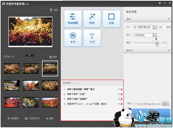 四、边框添加:很多摄影爱好者都喜欢给自己的照片加上边框,这样可以让照片看起来更专业,更具艺术性。美图秀秀批处理提供这一功能,批量拖拽、批量添加,15种各式风格的边框,黑框、白框可自由选择。