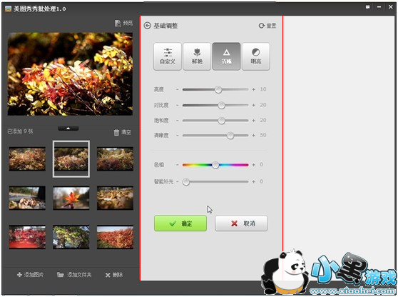 一、照片基础调整:在批处理基础调整功能中,分为自定义模式和设定模式(鲜艳、清晰、明亮),即用户可以自定义微调各个参数选项,给予用户最大的自由度,随自己的修图喜好把握照片的风格;同时,也可以按照软件工具的给予参数设定处理照片。当然,在设定的模式中,参数并非固定死板的,仍旧可以微调,这两种模式主要包含六项照片调整项:亮度、对比度、饱和度、清晰度、色相、智能补光,基本覆盖了一张照片曝光、层次、色彩、锐度等调整要素,考虑很周到。