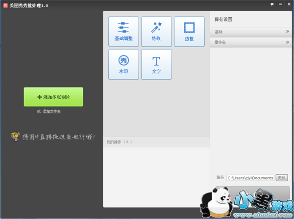 点击美图秀秀的批处理功能后,弹出批处理功能界面,我们可以一览美图秀秀批处理功能的概况,该功能支持多图添加、文件夹添加以及图片鼠标拖拽。批量处理工具主要具备如下几个功能特点: