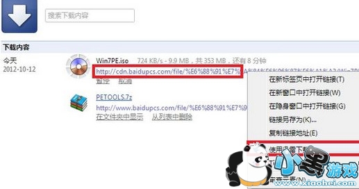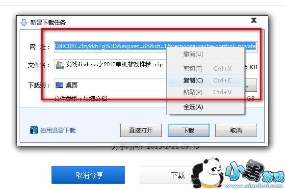 你点击下载,然后就开始下载了,这时底部的提示框后面有“查看下载”。点击后,进入下载列表,在你下载的文件上右键-----复制下载链接。