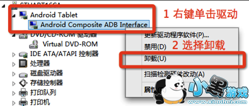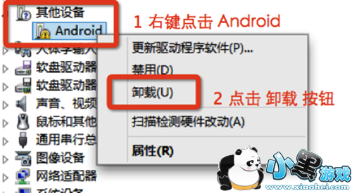 STEP1:在电脑的「设备管理器」中找到「其他设备」,点击该项目后会出现「Android」,右键单击驱动并在弹出菜单中选择「卸载」