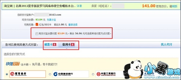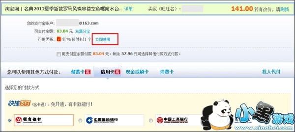 6、若红包不够支付交易款项,在付款页面可看到红包抵扣金额,可继续选择储蓄卡或信用卡的银行卡支付剩余的款项。
