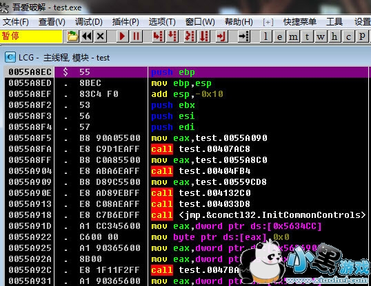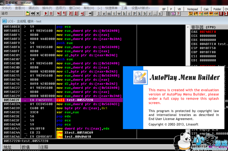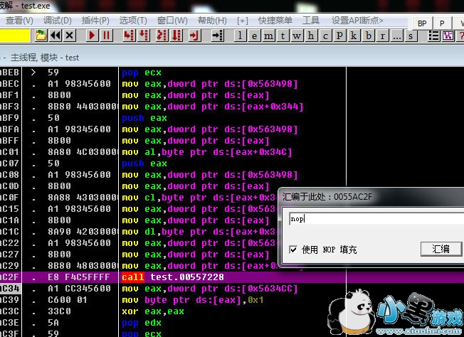 3秒之后界面消失,语句执行到下一行了,上面这个call test.00557228就是要找的,call后面是什么每个人都不一样,但就是这个call调出了这个闪屏界面。双击它,在弹出的对话框中写入nop,点击汇编,再关掉该对话框即可。