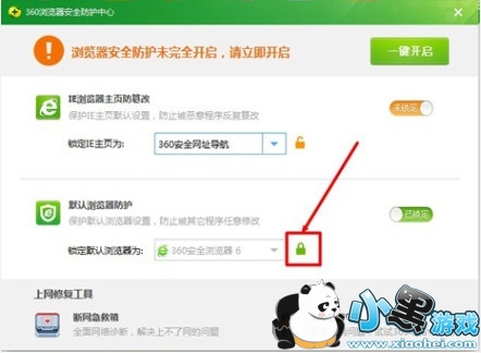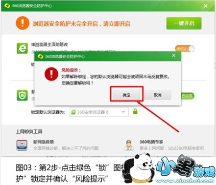点击绿色的“锁”图标,解除“默认浏览器防护”锁定并确定“风险提示”