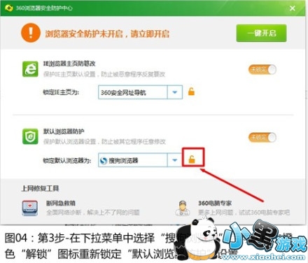在下拉菜单中选择“搜狗浏览器”后再次点击橙色的“解锁”图标重新锁定“默认浏览器防护”设置