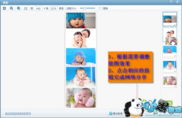 随后进入图片拼接编辑窗口,美图看看为我们提供了一个简洁的操作界面,上方的快捷工具栏可以实现拼图边框大小的调整、再增加新图片进行等操作;右方的图片缩略图区则可以通过拖动图片来实现顺序的调整,如图02所示。调整完成,再通过下方相应的分享按钮,即可一键实现腾讯微博和新浪微博的网络分享操作。
