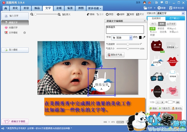 美图秀秀是一款强大的图片美化工具,同时其美化操作又非常的智能和傻瓜化,很简单的操作即可实现很漂亮的效果。如图04所示,我们可以为宝贝图片添加一些可爱的文字效果,来让图片更加的快乐有趣。