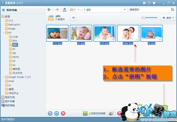 把自家宝贝的多张照片拼接起来发到微博分享,当然是最理想的方式。用美图看看不仅可以流畅的浏览自家宝贝的高清大图,而且还可一并实现图片的拼接操作哦!如图01所示,先在美图看看主界面下定位到图片文件夹,一次选择多张要拼接的图片后,再点击界面右下方的“拼图”按钮进入。