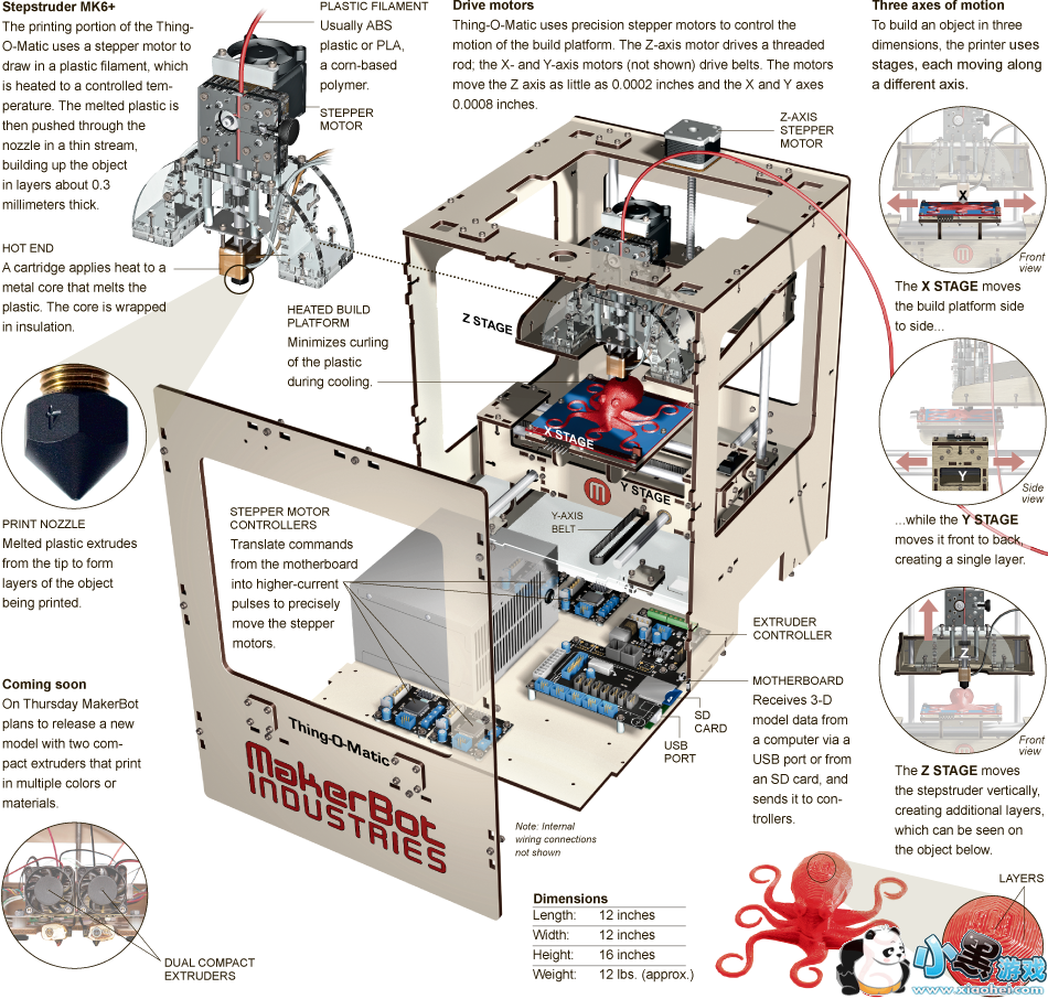 但现在,3D打印机可以做到和普通的喷墨打印机一样大小。很多创业公司都提供各种各样的打印机,比如 MakerBot 提供的 彩色3D打印机、香港 Makible 2000块钱的3D打印机、维也纳工业大学能打出 沙粒大小赛车模型的超高速打印机等等。