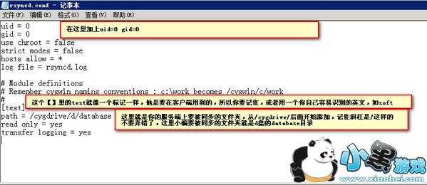 以上就是服务器端的安装了,然后就是配置,找到你rsync的安装目录点击进去里面会有个rsyncd.conf的配置文件,用记事本的方式打开他,在文件最前面追加"uid = 0" "gid = 0" 2行,然后修改 "[]" 的内容,这里小编直接上图,有图更容易看懂