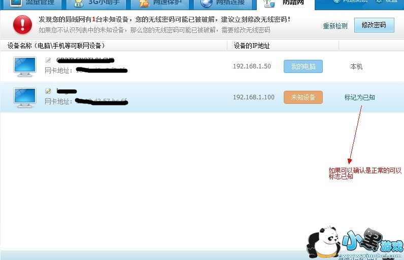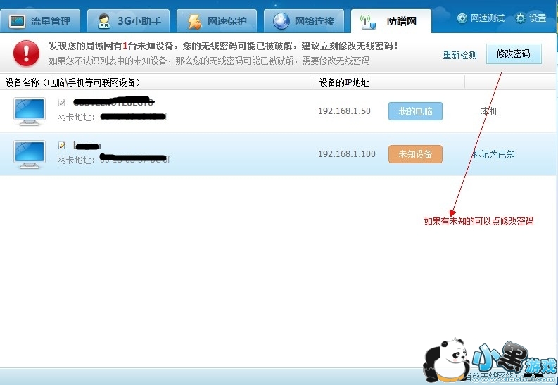 5.这里会显示出可能在蹭网的电脑,如果不是你允许的设备,可以点“修改密码”来对路由器进行重新设置,该页面会说明修改方法。这样我们的网络安全性就大大增加,且上网速度顺畅稳定了。