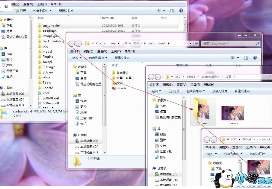 第二步在C:/Program Files/360/360sd/customskin4自建文件夹第三步在刚才自建的文件夹内新建文件夹并命名为main第四步将一张PNG格式的图片放入main文件夹,同一张改名为thumb放刚建的main文件夹外,好了