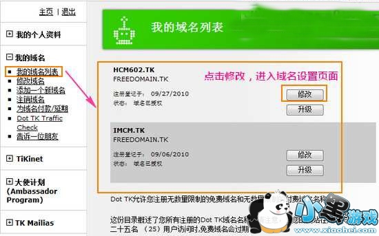 1.登录你的账号以后,点击“我的域名列表”,就会看到你目前拥有的tk域名: