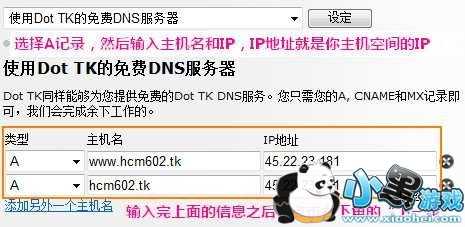 使用DOT TK的免费DNS服务器:这是我们用的最多的,直接选择A记录,然后输入主机名和IP即可,按照下图操作: