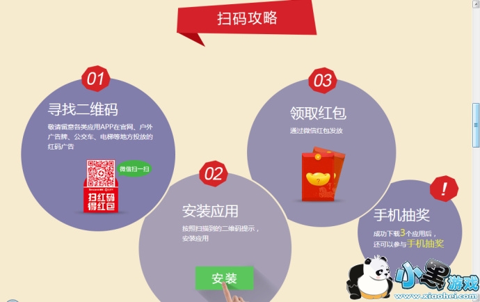 打开网页用微信5.1以上扫码,(每天扫码两次) 用微信扫红码,然后下载,无需安装。就会收到微信你的红包准备好了的信息去领取就行了,可以直接提现的。(需要工具:1.一部或者几部手机,主要是用来扫描应用,和收验证码的。2.N个QQ号或者手机号。3.一张银行卡就行了,全部Q号的钱打到你这银行卡。)