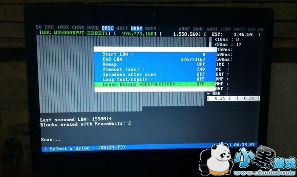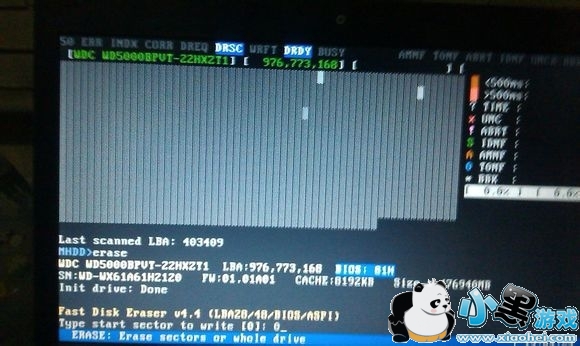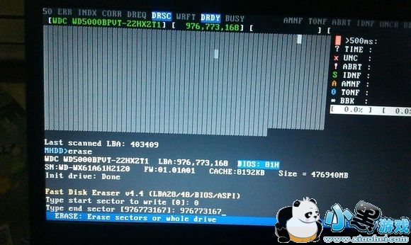 如果坏道较少,我们可以用MHDD软件对坏道尽心屏蔽,可以得到意想不到的结果,下面以我的WD500G笔记本为例,进行硬盘坏道屏蔽