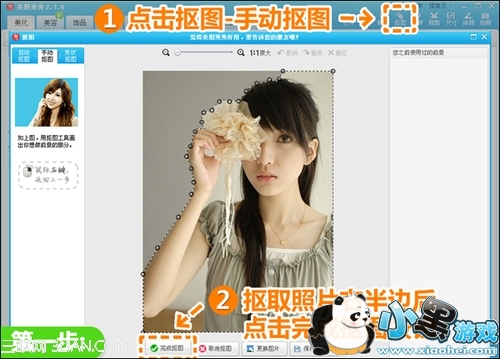 1、在“美图秀秀”中打开待处理照片。点击“抠图—手动抠图”,抠取照片的右半部分后,点击“完成抠图”按钮。