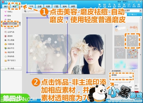 4、进入“美容”菜单下,点击“磨皮祛痘”按钮,选择“自动磨皮—普通磨皮—轻”;然后再点击“饰品—非主流印”,添加透明度为70%的光点素材,让图片更加唯美柔和。