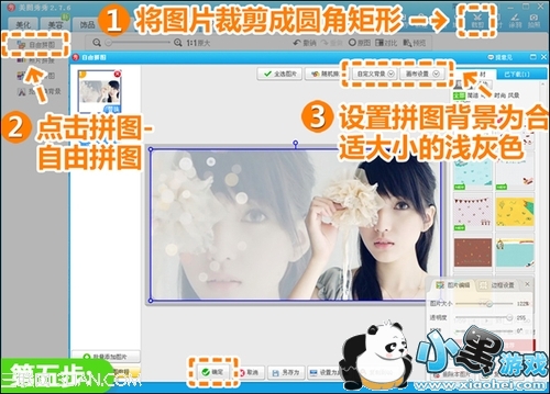 5、点击“裁剪”按钮,勾选“圆角裁剪”,将图片裁剪成圆角矩形,再点击“拼图—自由拼图”,给图片添加浅灰色背景框。