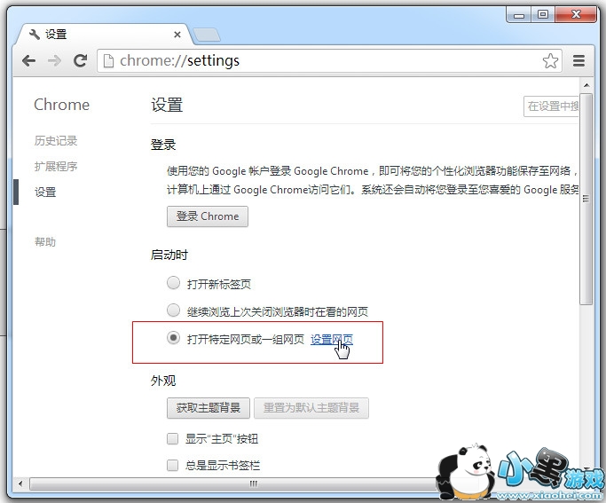 2.进入“设置”界面,选择“启动时”-“打开特定网页或一组网页”-点击“设置网页”