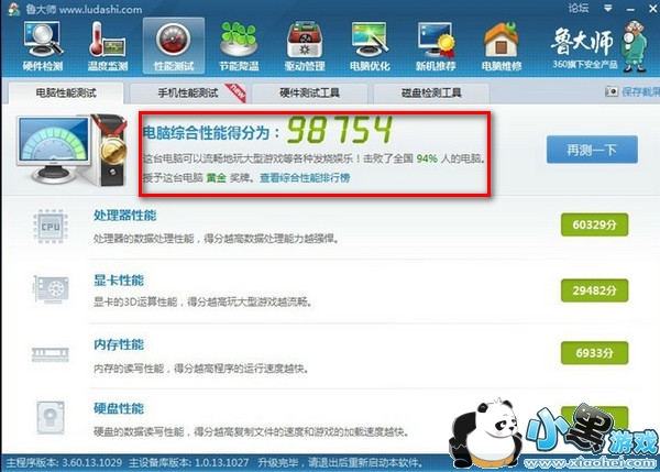 其实鲁大师这款软件的跑分只是作为一个大概的数据看看而已,真正的性能不能表现出太多,一定要做个比较的话,可以在性能测试完毕后点击分数下面的查看综合性能排行榜,看看自己的电脑性能在所有鲁大师用户中的排名情况。
