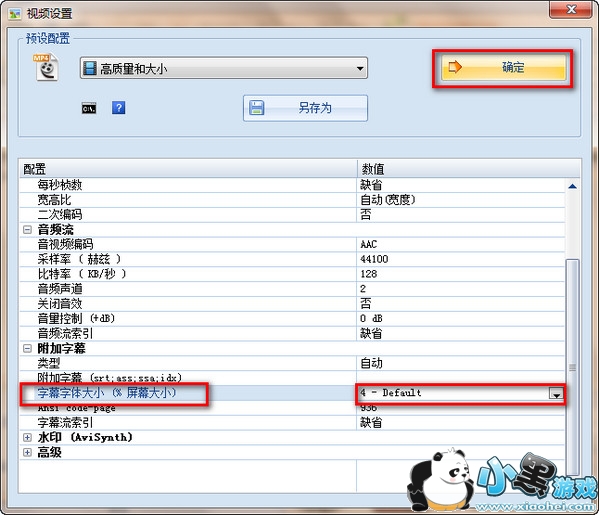 注意:选择字幕字体的大小,主要是相对于屏幕大小来说,然后点击“确定”