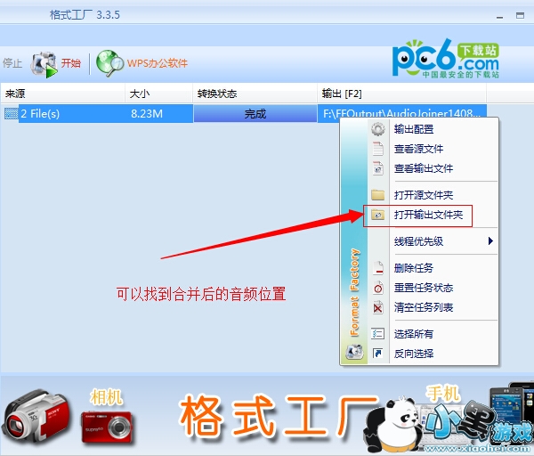 6.任务完成进度达到“100%”之后,右击任务,弹出菜单中选择“打开输出文件夹”就可以查看自己合并完成之后的视频。