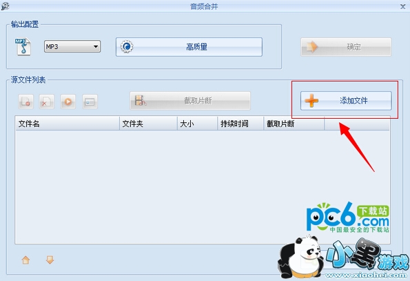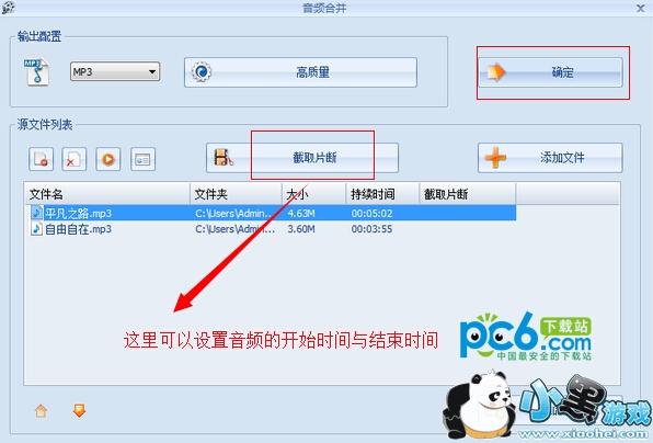 4.找到自己想要合并的两个或者多个文件,添加进去之后,可以通过截片片断设置音频的开始和结束时间,如果只是单纯地合并,直接点“确定”。
