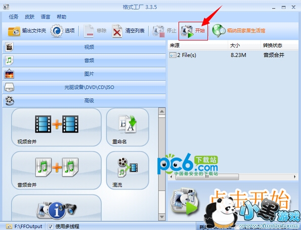 5.回到主界面,看到了刚刚建立的任务了,点击工具栏的“开始”,格式工厂便开始合并添加的多个音频,等待任务的完成。