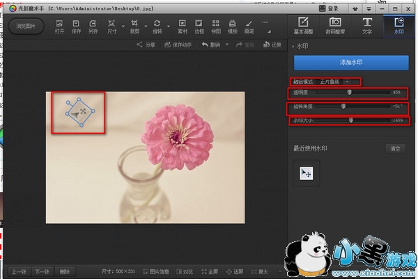 第四步:添加进来后,在后边的区域对水印进行调节,(可以调节大小,图片的样式,旋转的角度,已经透明度)