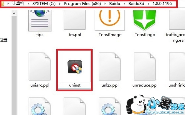 2、进入百度杀毒默认安装路径:C:/Program Files (x86)/Baidu/BaiduSd,双击uninst卸载程序,进行常规卸载