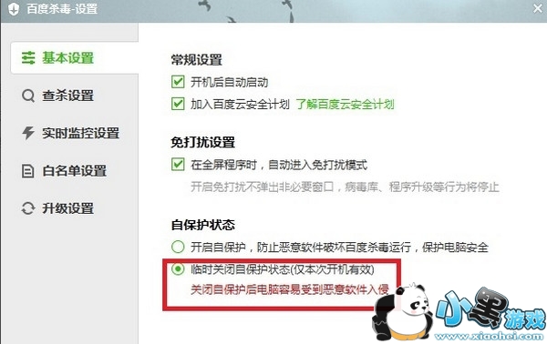 1、首先一定要做这一步,打开百度杀毒-设置-基本设置-自保护状态-临时关闭自保护状态(仅本次开机有效)-确定