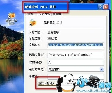 第三步:点击属性后,找到“酷我音乐盒的”目标,然后点击“查找目标”
