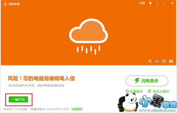 出现“风险!您的电脑易被病毒入侵”提示,可能是由于您未开启百度杀毒“实时监控”或“自保护”功能引起的。请您在主界面右上角点击倒三角下拉菜单,进入设置中心,检查您是否开启实时防护和软件自保护,您也可以从主界面直接操作“一键开启”。
