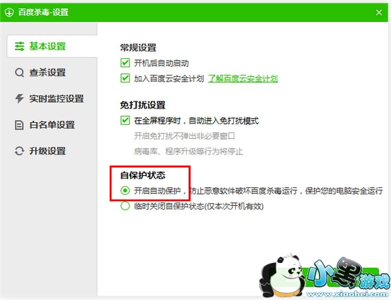 自保护状态是对百度杀毒软件自身运行的保护措施,防止恶意软件妨碍百度杀毒的运行。关闭自保护状态后,百度杀毒的运行可能遭到恶意软件的妨碍,导致您的系统有面临风险。您可以在“设置中心”开启或临时关闭自保护状态。