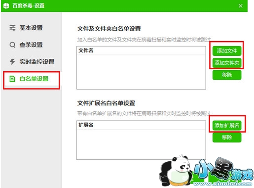 第二步:进入设置中心,点击白名单设置。在白名单设置中,选择添加文件或者添加扩展,将信任文件、文件夹或带有扩展名的文件添加到白名单(添加到白名单的文件或文件夹数量没有限制)。