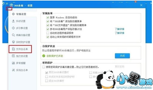 第二步:在“360杀毒-设置”界面中点击“文件白名单”,