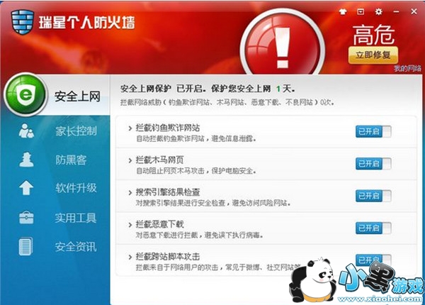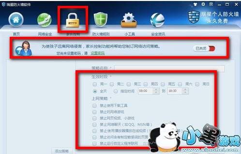 这个功能很多家长应该非常喜欢哦!瑞星个人防火墙本次升级还优化了“家长控制”功能。家长可以自行制定网络访问策略,禁止运行某些联网程序,更好地控制了网页浏览及下载行为。有了这项功能可以防止孩子沉迷网络,防止不良页面对未成年人的侵害。是家长的好帮手!