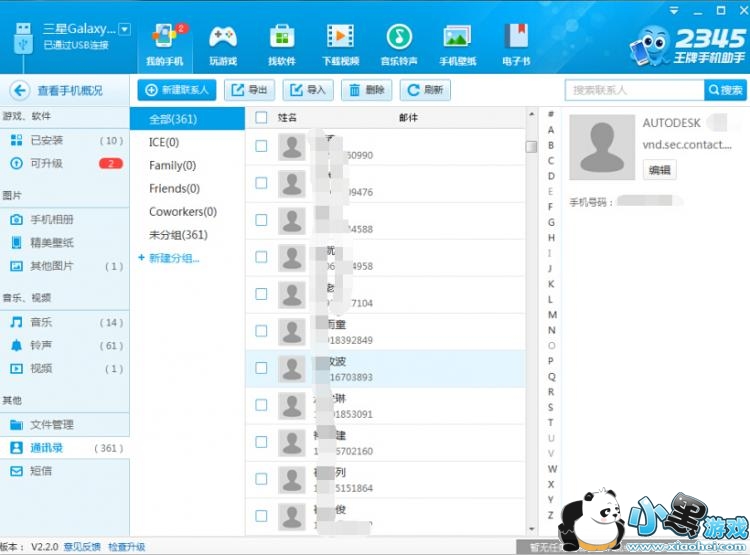 步骤三、将联系人导入到B手机,如下,将B手机与2345手机助手电脑端成功连接,进入“通讯录”界面。