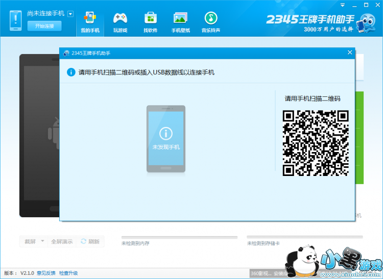 第二步:打开2345手机助手电脑版,点击“开始连接”按钮,弹出带有二维码的窗口。