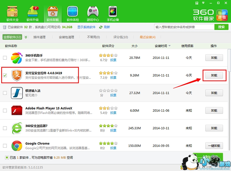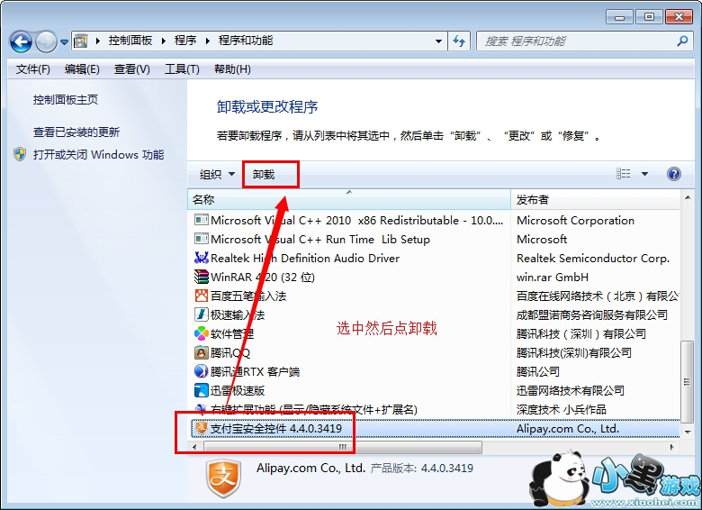 2.进入软件卸载后,找到支付宝安全控件,然后选中,再点右边的卸载即可。
