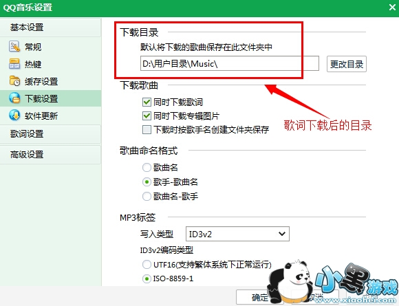 同时记住下载目录,因为后面歌词下载完后的保存目录也在这个下载目录中。(如小编电脑中的目录是D:/用户目录/Music/,待会直接打开这个目录就能找到下载的歌词)