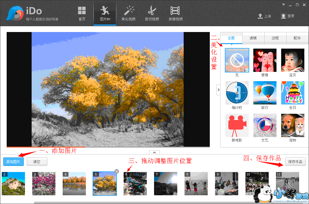 第二步:美化设置,点击界面的右方,这里可以有主题选择、滤镜设置、边框设置和配乐设置