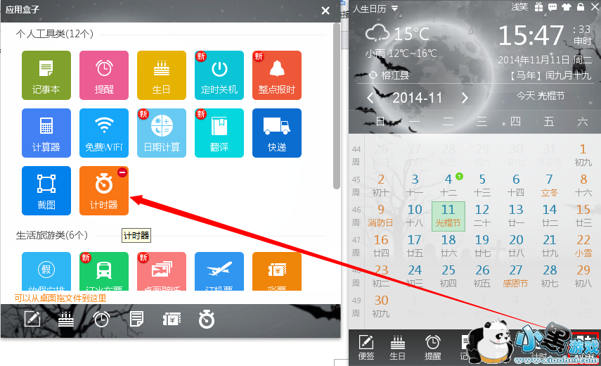 首先打开人生日历客户端右下角的应用按钮,在跳转出来的应用盒子界面上找到计时器按钮。