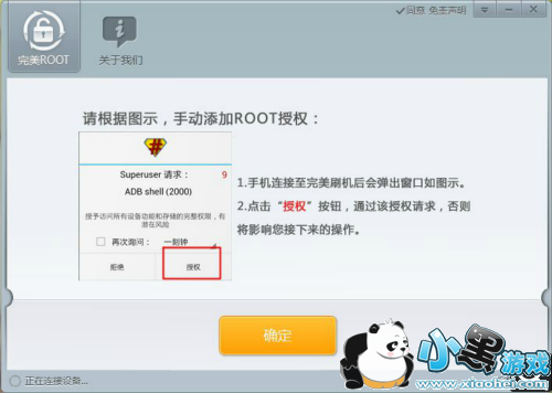 三星note3 n9005完美root教程温馨提示:一键root软件运行1-3分钟,不要移动或触碰手机,耐心等待。另外,点击“完成”后,软件弹出提示页面,见下图,完成手动添加三星note3 n9005 root权限,即手机界面出现Superuser请求,点击“授权”选项!