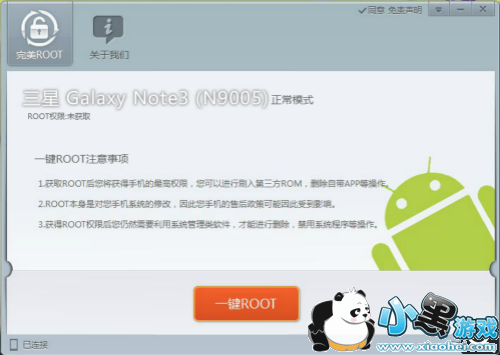 三星note3 n9005 root开始:完成一系列root准备后,双击启动完美ROOT软件,软件开始尝试连接手机。三星note3 n9500 root教程提醒:完美ROOT可以自动检测手机有没有安装驱动,没有安装的话会自动开始安装,实际操作中机友们需要按照软件提示操作!Root软件成功连接三星n9005后,直接进入三星note3 n9005一键root页面,现在看页面的“一键ROOT注意事项”,之后直接点击“一键ROOT”选项,软件正式开始三星note3 n9005完美root!