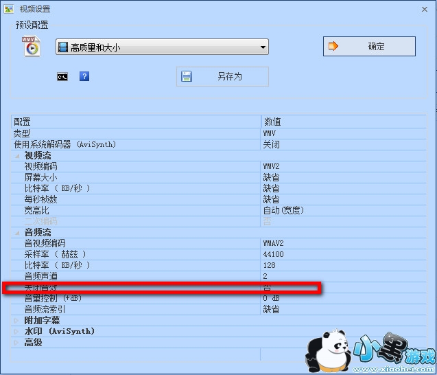 第五步:可以看到在“配置”“音频流”下的“关闭音效”左边的值是“否”,点击右边的值,在下拉列表里选择“是”,然后单击[确定]按钮