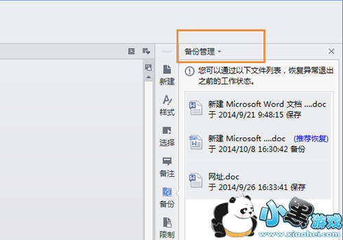 第二步:在wps界面右边会弹出备份管理界面,即可对备份文件进行操作,如图所示: