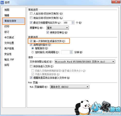第四步:在弹出的方框中,点击【常规与保存】,可对备份功能进行设置。