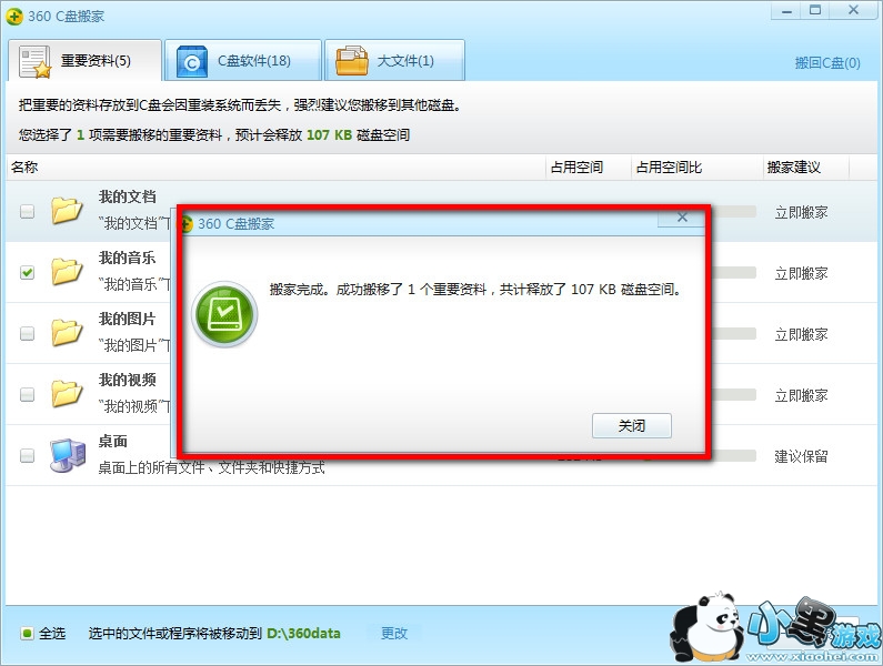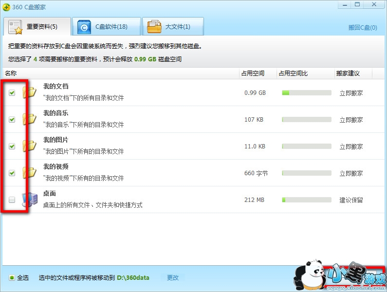 第三步:接着程序会对整个磁盘进行扫描,以确定可以进行搬家的内容。在“重要资料”项中,勾选“我的文档”。